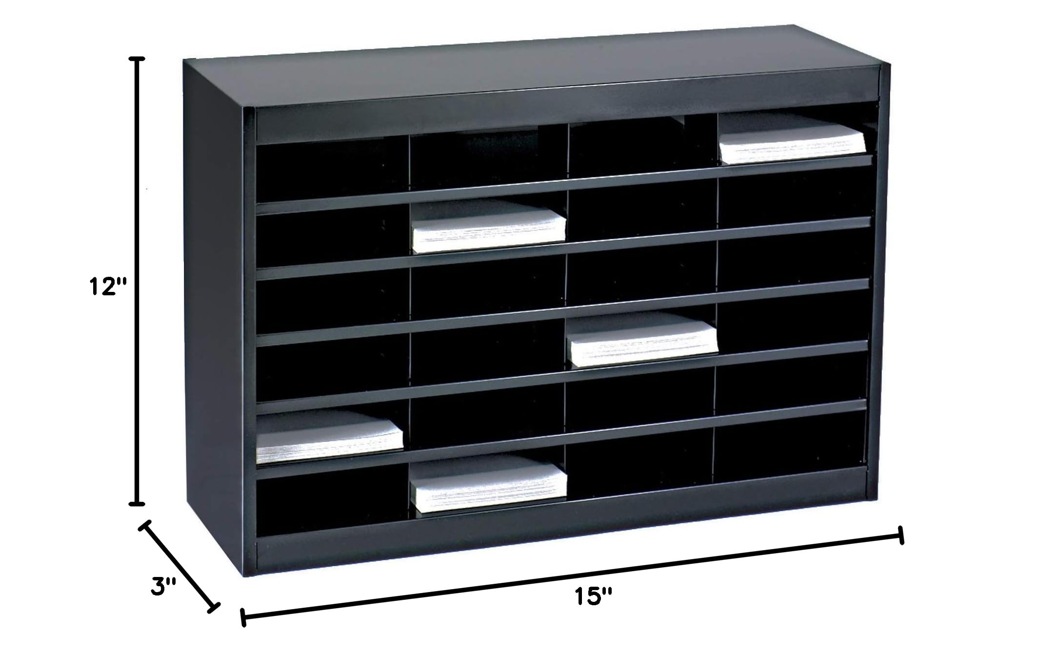 - EFFICIENT ORGANIZATION. Twenty-four 9"W x 12.25"D x 3"H compartments each hold 750 sheets of paper or up to 10 lbs. Shelf fronts serve as label holders (labels not included).